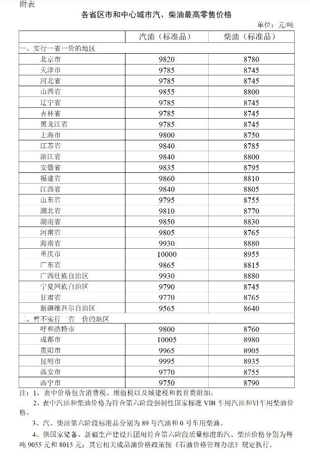 附:各省区市和中心城市汽、柴油最高零售价格