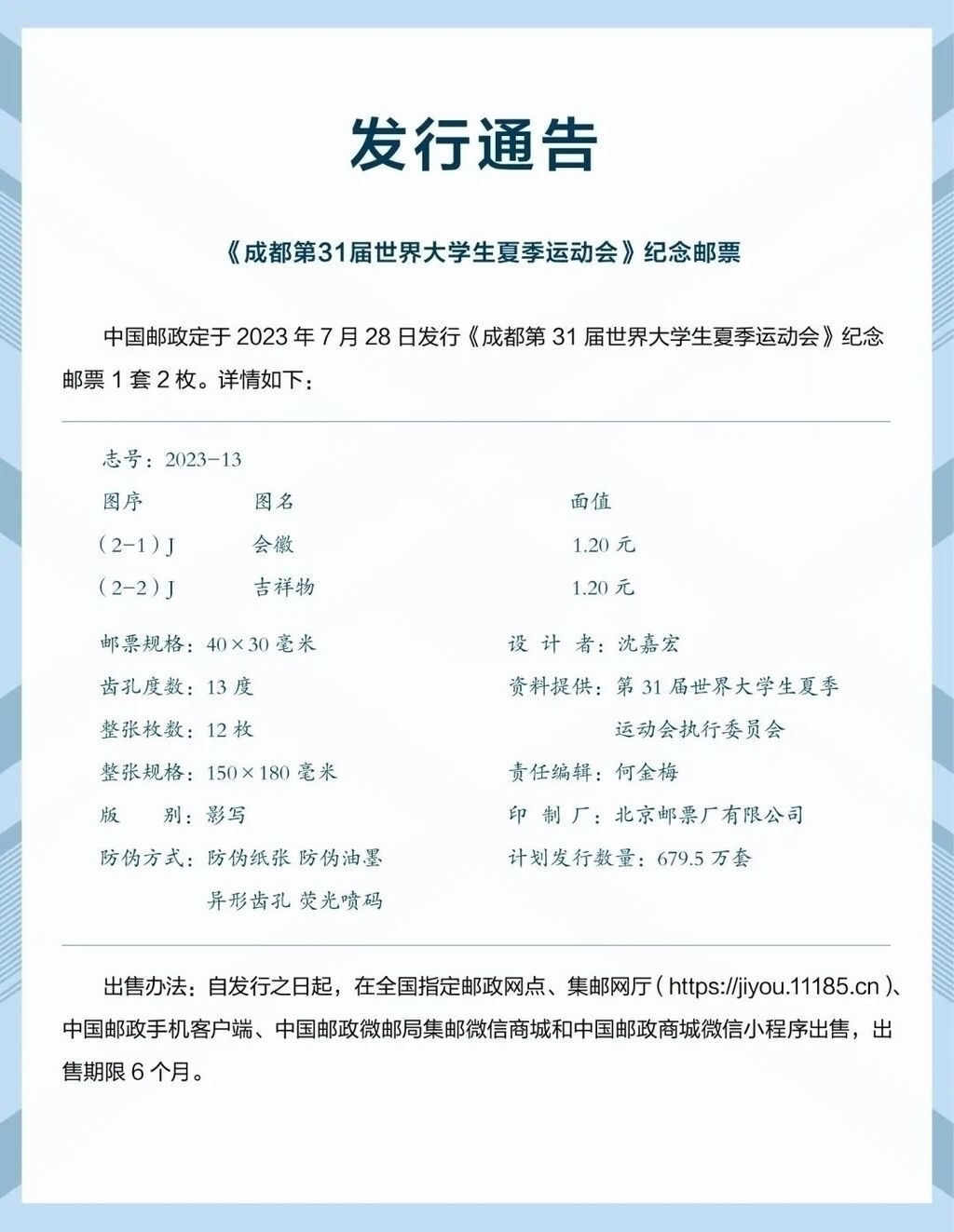 邮票计划发行数量为679.5万套