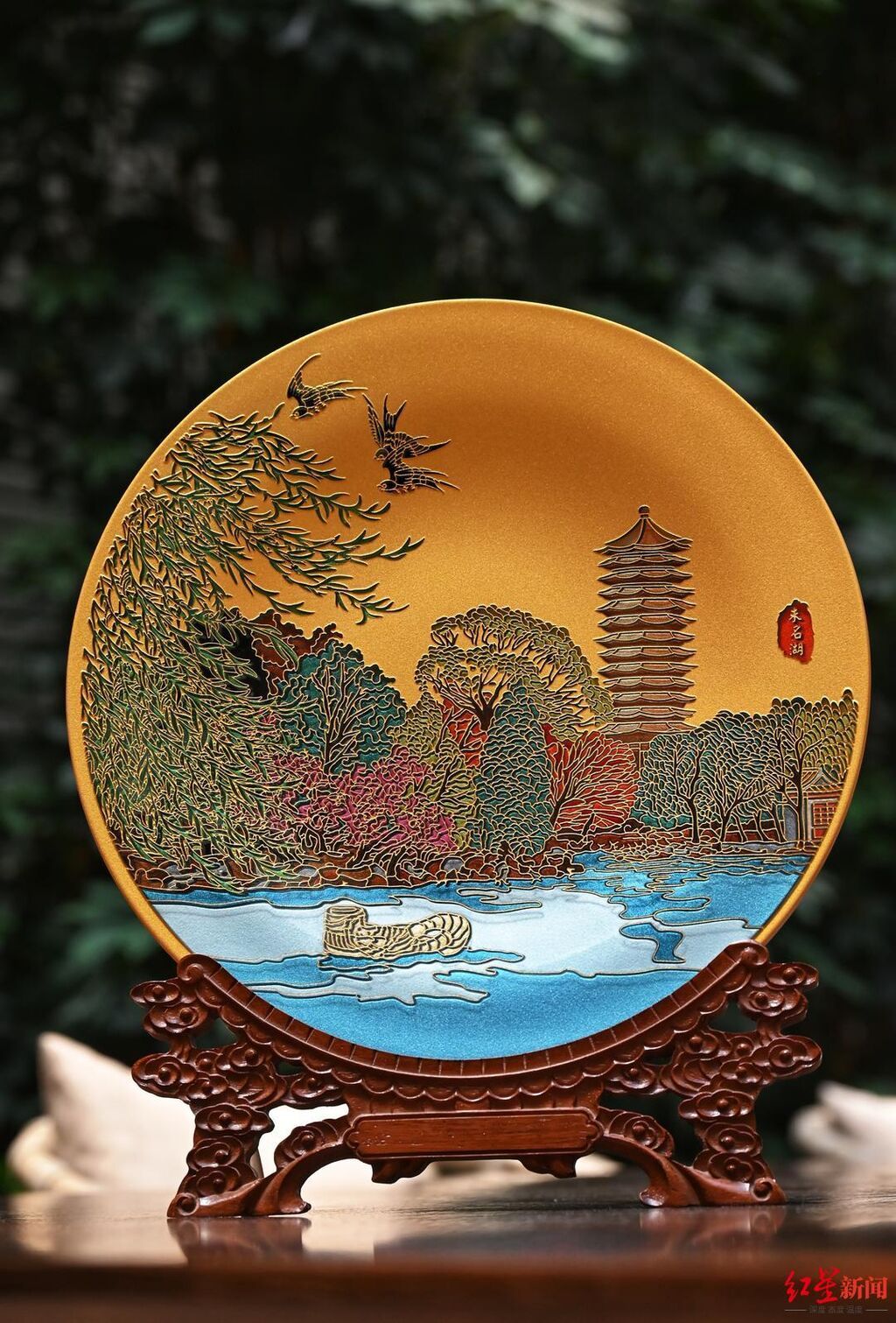 来自北京大学的雅琅晶摆盘再次映入我们的眼帘,这个雅琅晶工艺的彩绘玻璃盘上,有北大典型的校园风景——未名湖、博雅塔,湖边还有北大很有特色的翻尾石鱼石雕。此外,湖畔有花神庙的山门,还有侯仁之先生给未名湖题的字。博雅塔,这座北大校园里最高的建筑,曾是一座水塔,如今早已是广为人知的北大地标。而未名湖,是北京大学校园内最大的人工湖。据了解,雅琅晶首创珠晶丝浮雕、镂空彩绘等技术,巧妙地利用了玻璃的透性以及折光性,在晶化玻璃盘的正反面采用凹凸精细雕刻工艺,再经过手工彩绘、高温烤制,实现永久不褪色。