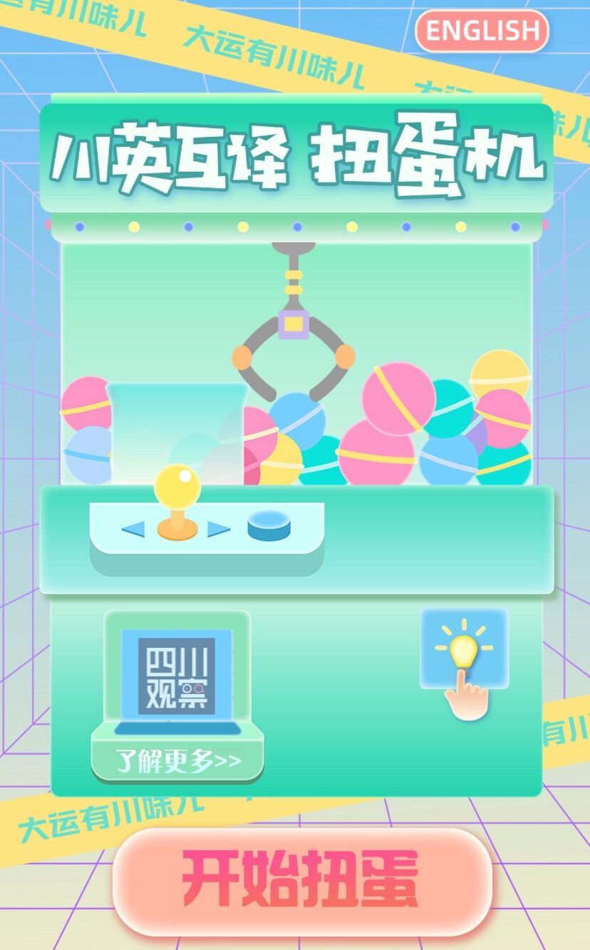 四川观察推出川英互译“川味儿”大运扭蛋机,收集15句四川方言里常用的短语,并配普通话和英文与之对应,扭一扭就能随机选取相关短语进行学习。