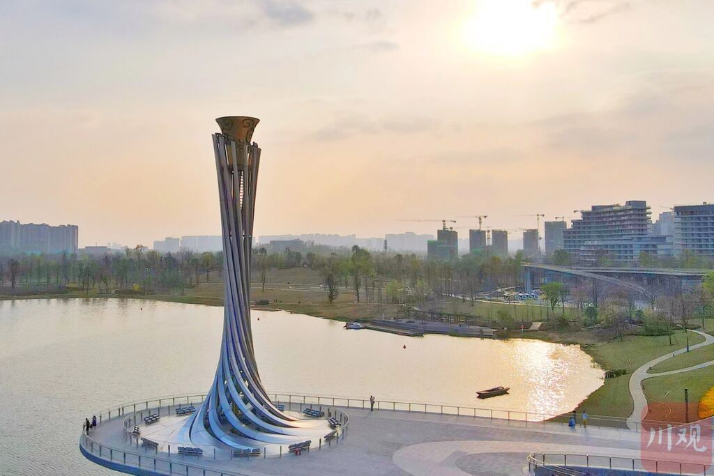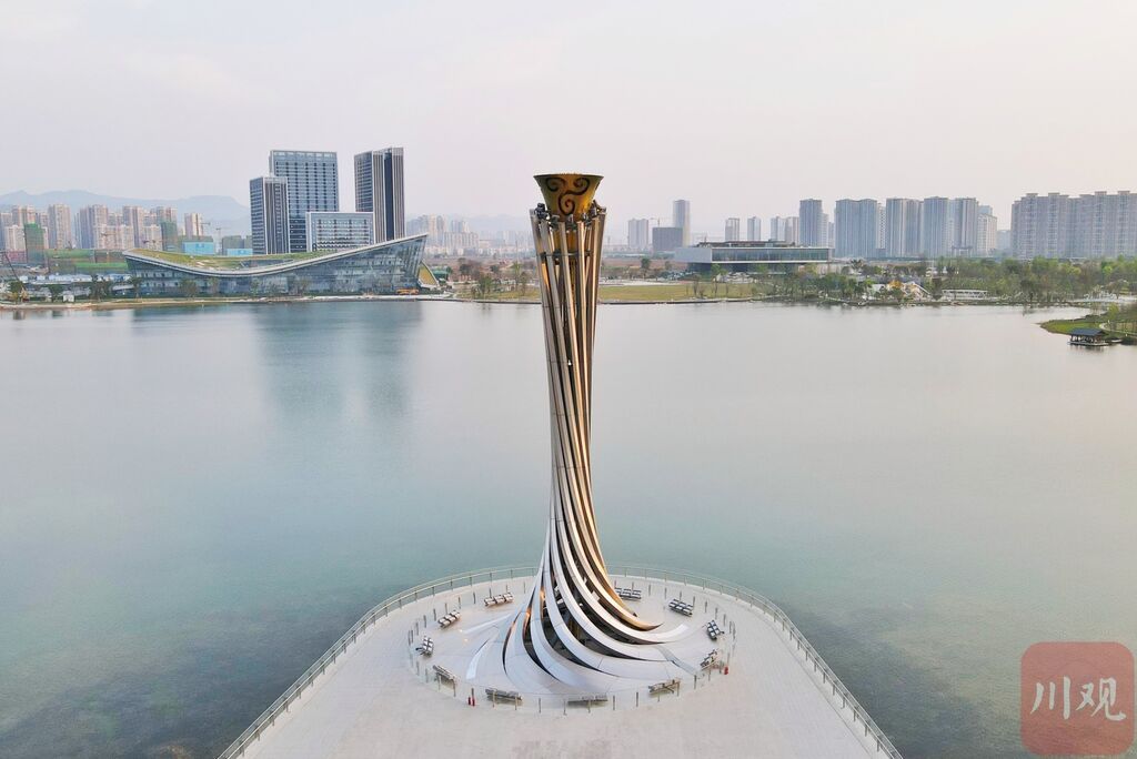 成都大运会主火炬塔,位于东安湖体育公园主体育场南轴深入东安湖湖面约5米处,塔身高度31米,寓意第31届世界大学生夏季运动会。