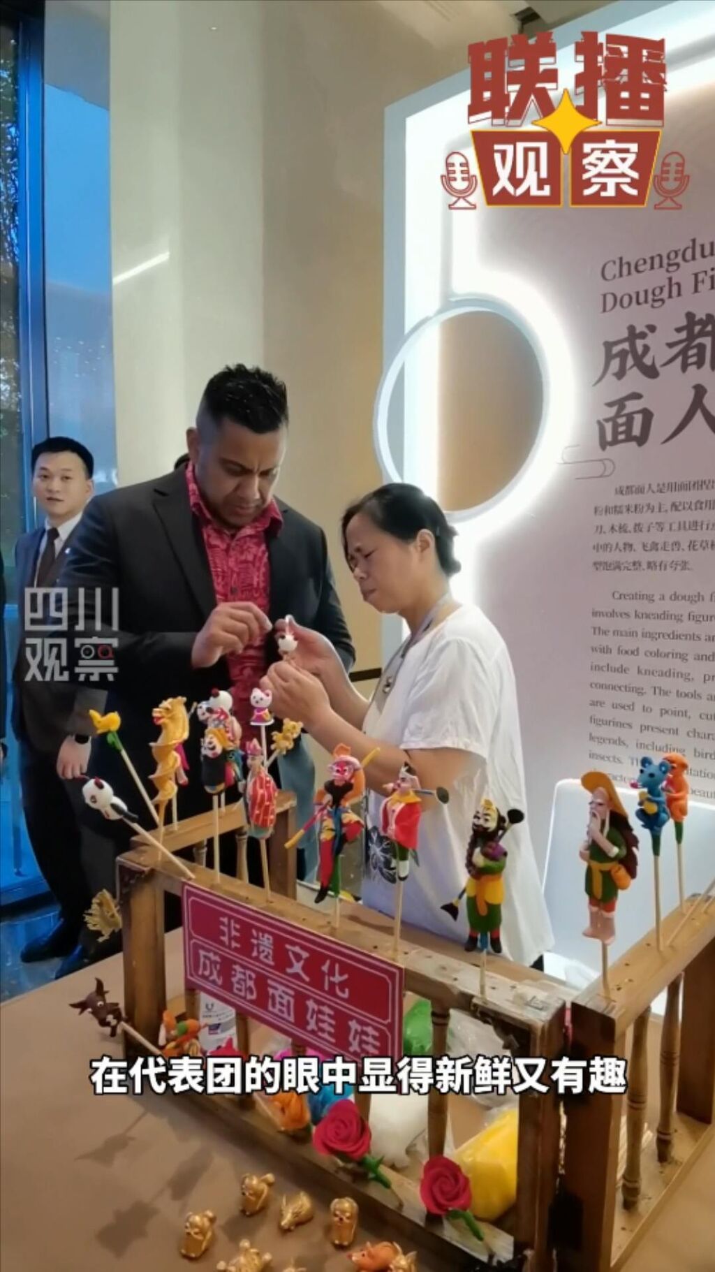 成都糖画、成都面人、剪纸、竹编等这些我们从小看到大的非遗技艺,在代表团的眼中显得新鲜又有趣。亲手捏一只熊猫面人、尝尝糖画的香甜滋味,这可能就是各国使节们对成都的初印象。