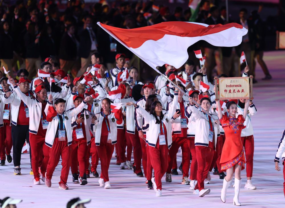 7月28日,印度尼西亚大学生体育代表团在开幕式上入场。新华社记者张丽芸摄