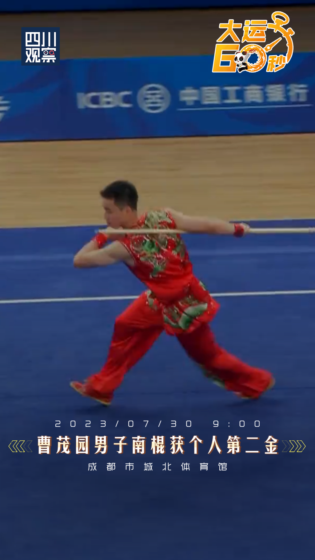今天举行的武术比赛,中国队共获得4枚金牌。上午,来自四川的中国选手曹茂园凭借完美发挥,获得9.753分,首先摘得武术套路男子南棍金牌。这是继昨天男子南拳摘金后,曹茂园再度将金牌收入囊中,成为成都大运会开赛以来首位夺得两金的选手。此外,中国选手陈小丽斩获女子太极剑金牌,中国选手金哲典武术男子刀术,另一名四川籍中国选手宋翠芳获得武术女子南拳铜牌。