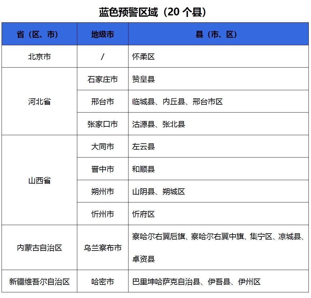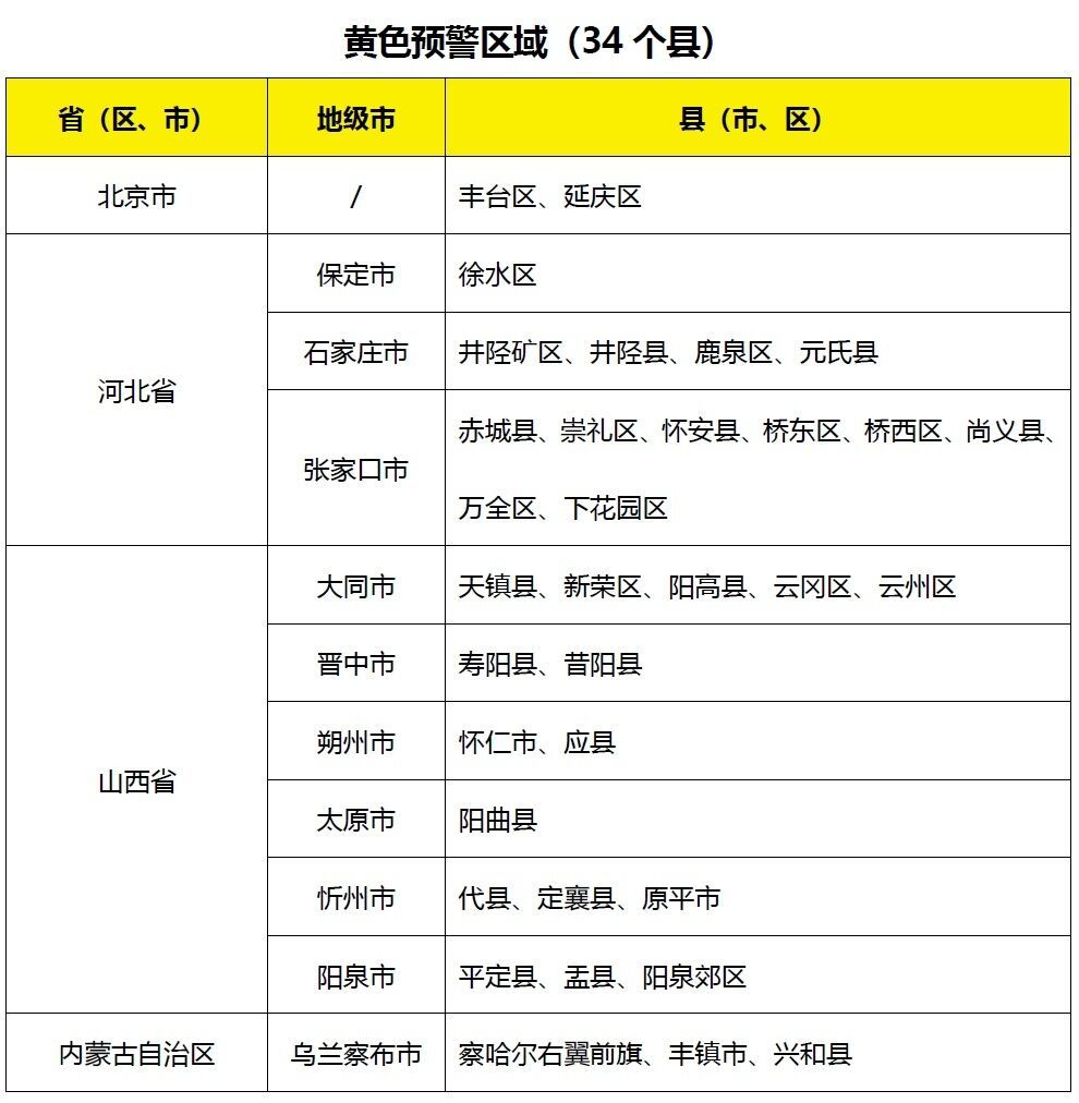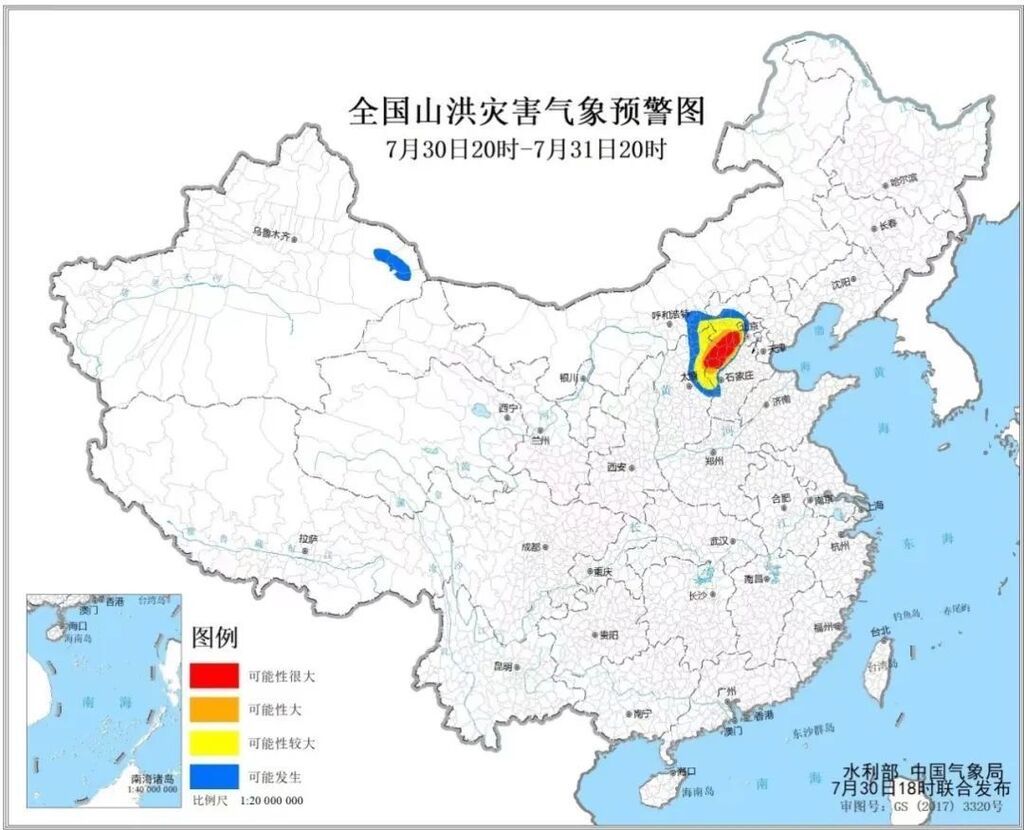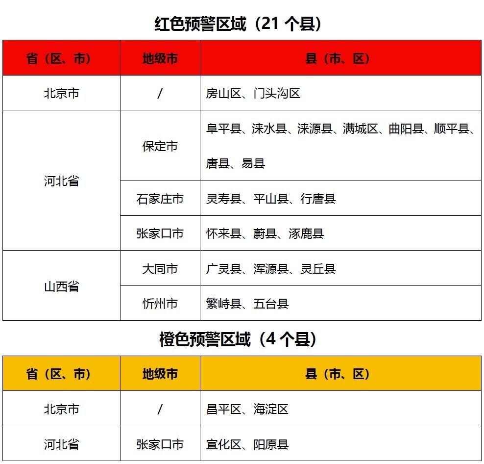 预计,7月30日20时至7月31日20时,北京西南部、河北中部、山西东部等地部分地区发生山洪灾害可能性大(橙色预警),局地发生山洪灾害可能性很大(红色预警),预警区域涉及的县(市、区)见下表。其他地区也可能因局地短历时强降水引发山洪灾害,请各地注意做好实时监测、防汛预警和转移避险等防范工作。