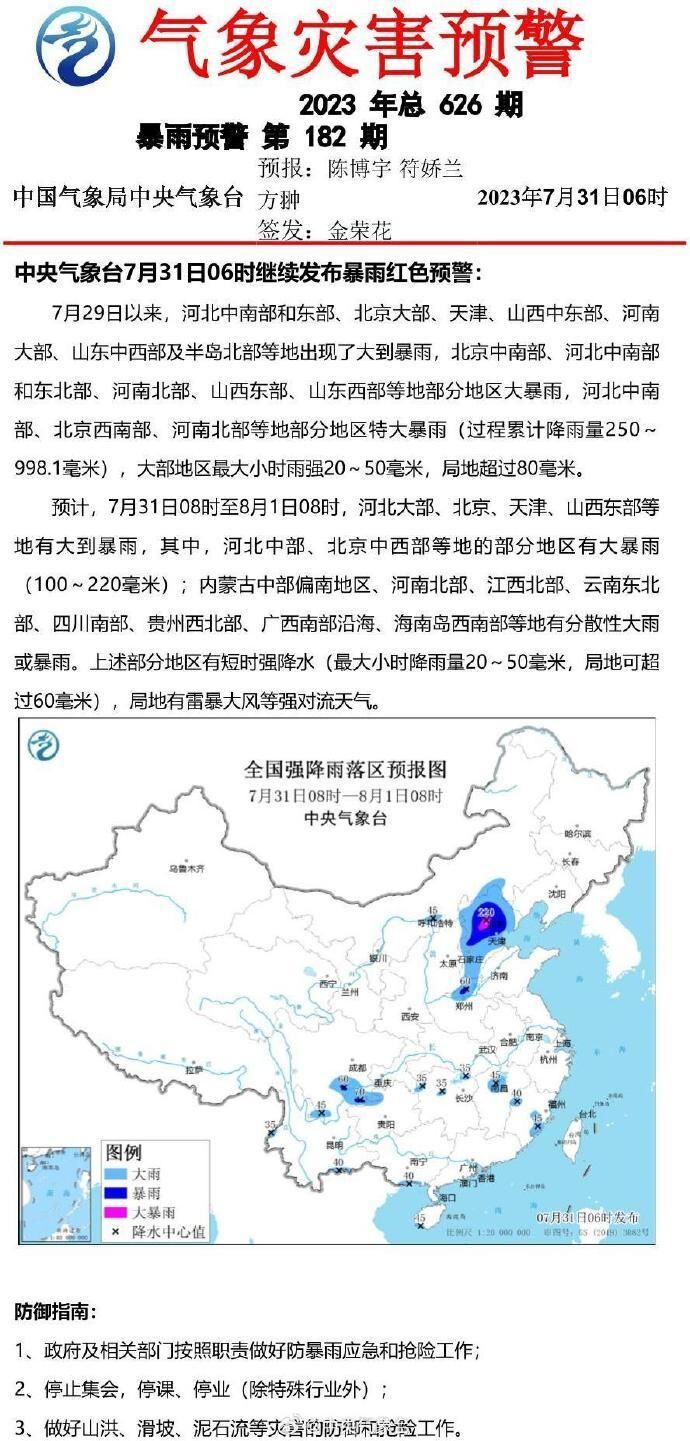 中央气象台7月31日6时继续发布暴雨红色预警: