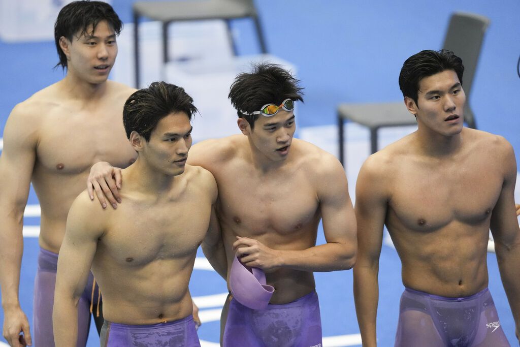 由徐嘉余、覃海洋、王长浩和潘展乐组成的接力队在决赛中后来居上,以3分29秒00打破了亚洲纪录,获得银牌。美国队以3分27秒20夺冠。徐嘉余在100米后暂列第五,第二棒“蛙王”覃海洋从第五名追到了第二名,蝶泳选手王长浩在300米后落到第三,但第四棒潘展乐表现神勇,在冲刺阶段追上了澳大利亚队,获得银牌。