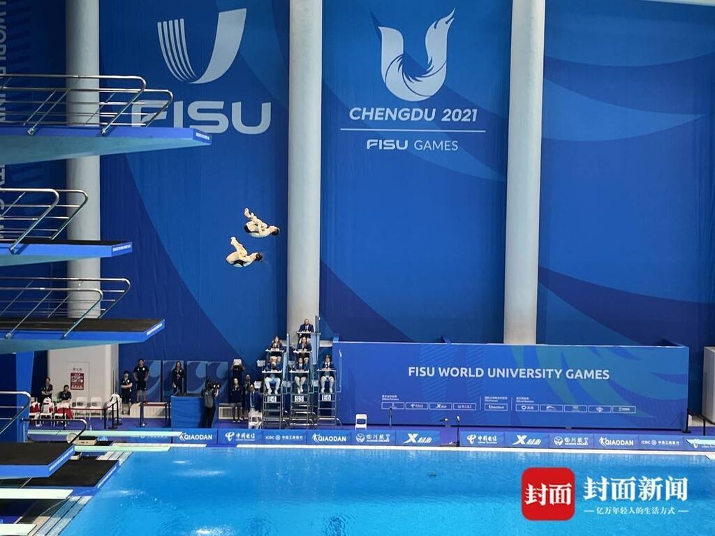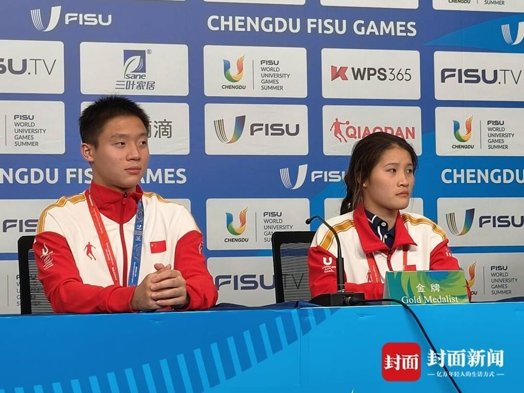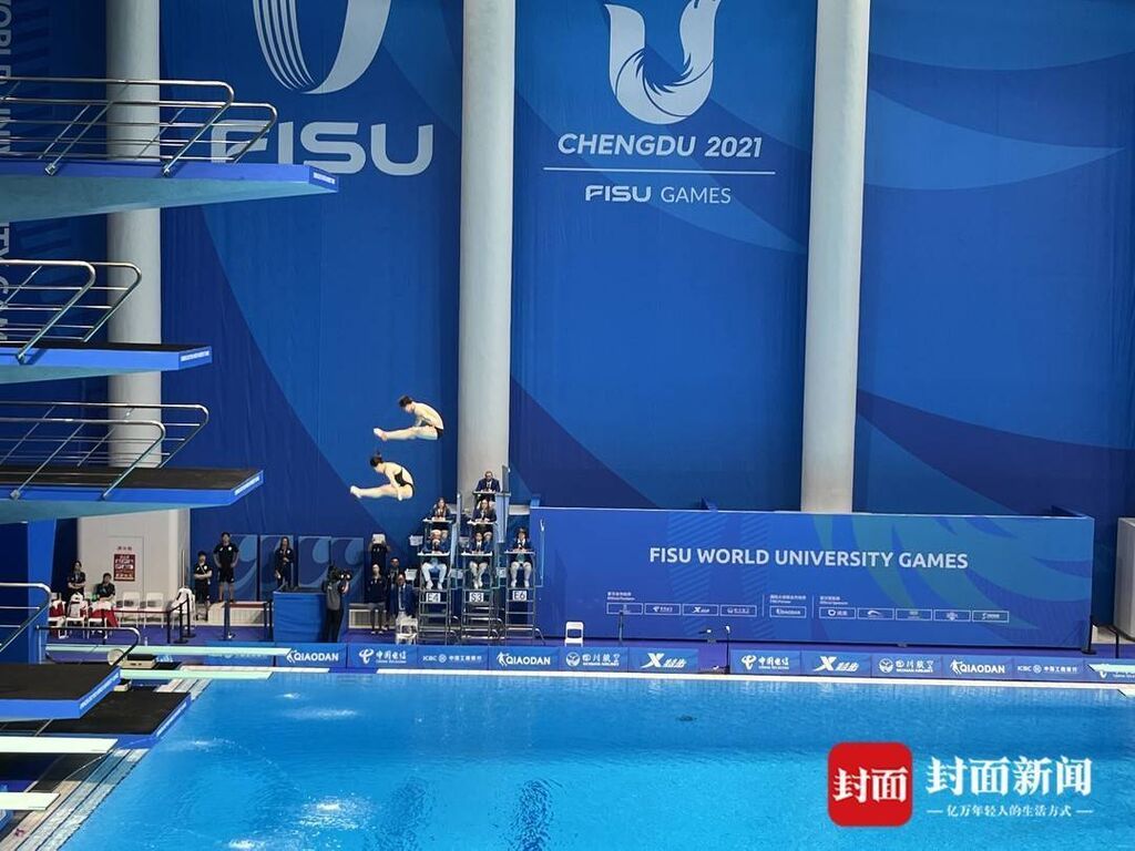 8月4日,成都大运会跳水项目第9块金牌争夺战,中国选手王彬翰与王伟莹出场,全场欢呼。