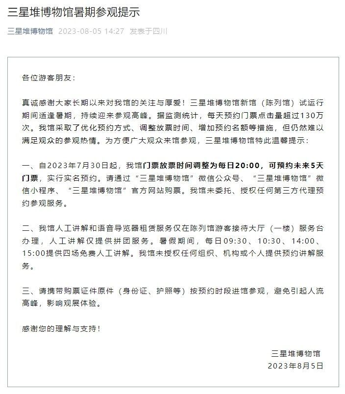 8月5日,三星堆博物馆发布暑期参观提示,内容如下:
