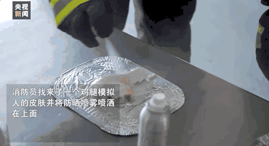 用鸡腿模拟人的皮肤,在喷上防晒喷雾约5秒后,拿出点火器点火,此时鸡腿突然着火,还伴有滋滋的声响。