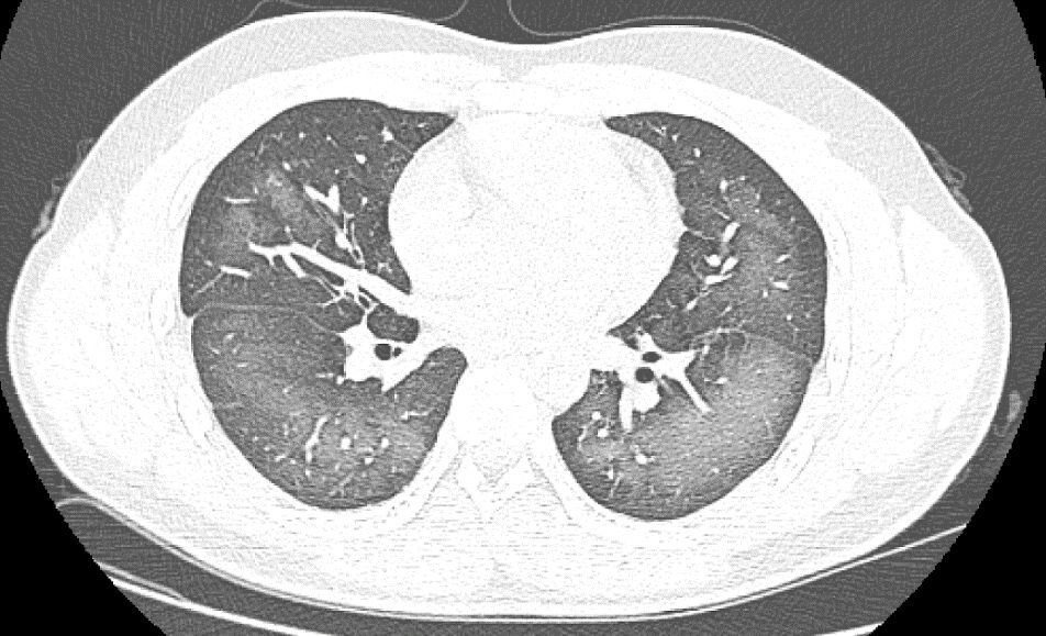 经检查,肺部CT片显示,李林双肺赫然呈现大范围白色样病变,报告提示“白肺”。