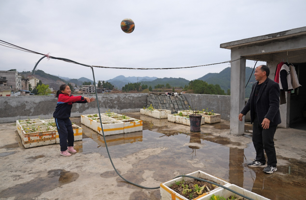 3月27日,李文文在屋顶露台和父亲玩投篮游戏。李文文是贵州台江县台盘乡中心小学的女篮队长,以前他的父亲在外地务工,如今火爆全网的“美丽乡村”篮球联赛给台盘乡带来了人气,父亲在家门口就能找到工作。