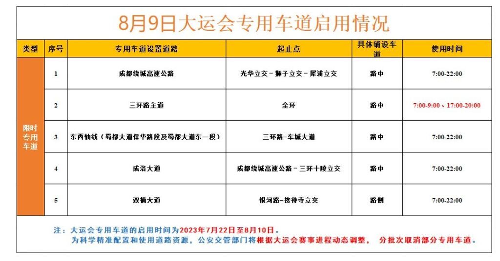 据悉,12条基于公交专用车道设置的大运会专用车道取消后,还有三环路主道(全环双向)、蜀都大道保华路段及蜀都大道东一段(三环路—车城大道双向)、成都绕城高速公路(光华立交—狮子立交—犀浦立交双向)、成洛大道(成都绕城高速公路—三环十陵立交双向)、双楠大道(银河路—接待寺立交双向)5条大运会专用车道在继续启用。后期,成都公安交管部门将根据大运会赛事进程情况进行动态调整,分批次取消部分专用车道。