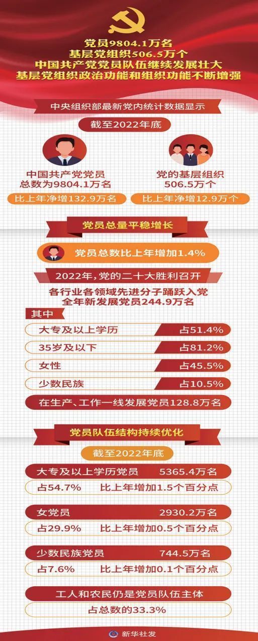 中央组织部最新党内统计数据显示,截至2022年底,中国共产党党员总数为9804.1万名,比上年净增132.9万名。党的基层组织506.5万个,比上年净增12.9万个。历经百年风雨和新时代10年革命性锻造,中国共产党更加坚强有力、更加充满活力,党的组织体系日益严密,党的执政根基不断巩固。 新华社发
