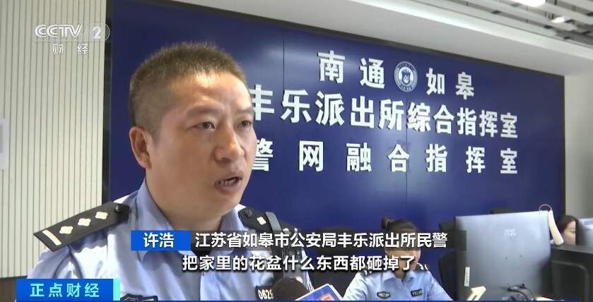 江苏省如皋市公安局丰乐派出所民警 许浩:女的跟男的吵架后喝醉了,把家里的花盆什么东西都砸掉了,然后把家里房间点了一把火,把家里的锅、碗、盆、垃圾桶等东西往楼下扔,把停在楼下的一辆车的车顶、驾驶室的玻璃都砸坏了。