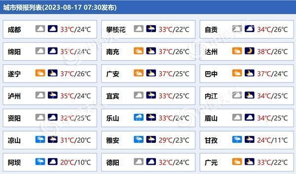 今天(8月17日),四川盆地部分地区仍有高温现身,东北部最高气温可达36—38℃。此外,四川盆地西南部、川西高原等地部分地区雨势较强,局地可能出现大到暴雨,公众需注意防暑和防雨。