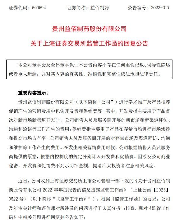 2023年6月,益佰制药收到上交所年报监管函,被要求补充披露销售费用前五大支付对象;学术推广、营销平台建设等市场费用主要核算内容明细情况;销售费用支付对象中是否涉及公司经销商、关联方或其他利益相关方等相关信息。