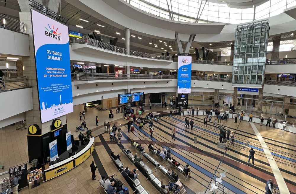 这是8月17日在南非约翰内斯堡坦博国际机场拍摄的显示有金砖国家领导人会晤信息的电子屏。新华社记者陈诚摄