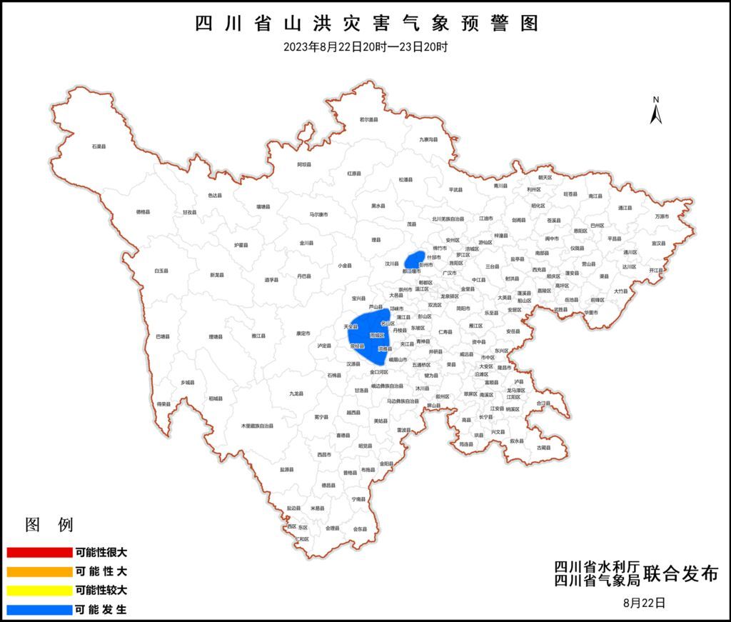 8月22日17时,四川省水利厅、四川省气象局联合发布山洪灾害蓝色预警。