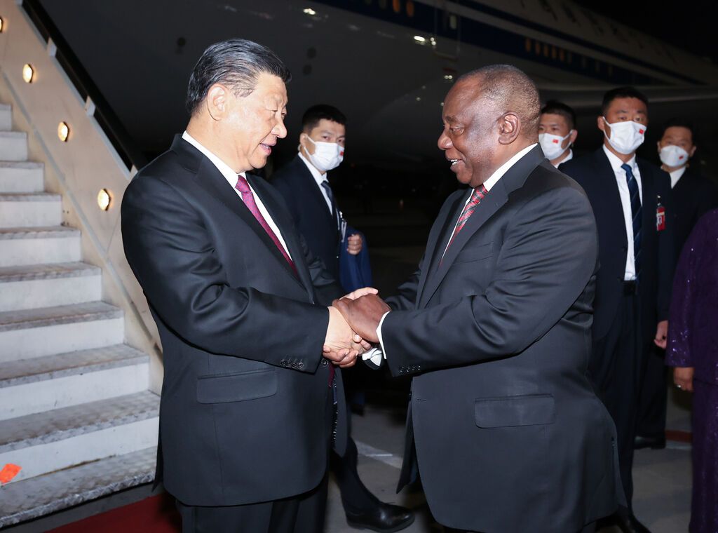 晚11时许,习近平乘坐的专机抵达约翰内斯堡坦博国际机场。南非总统拉马福萨率外长潘多尔,陪同部长、总统府妇女、青年部长祖马等政府高级官员在舷梯旁热情迎接。