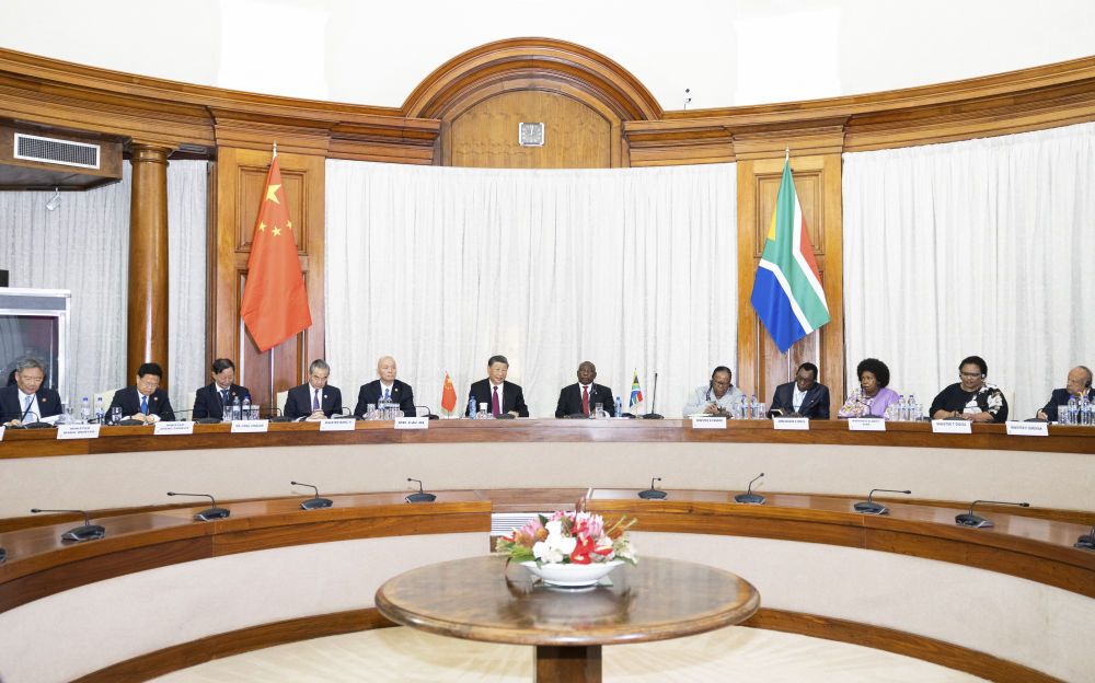 在同拉马福萨总统的会谈中,习近平主席指出,近年来,金砖国家秉持开放包容、合作共赢的金砖精神,书写了不同制度、不同文化、不同地域国家携手发展的精彩故事,成为南南合作的一面金字招牌。