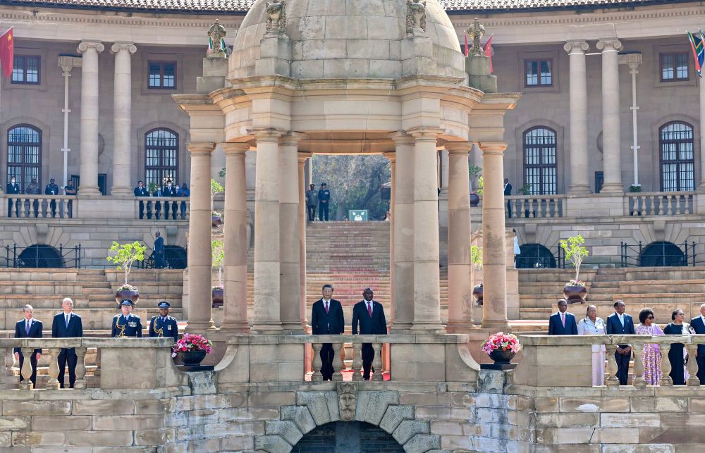 在总统摩托车队护卫下,习近平主席乘车抵达总统府,拉马福萨总统在下车处热情迎接。两国元首登上检阅台。仪仗队行持枪礼,军乐队奏中南两国国歌,现场鸣放21响礼炮。习近平主席检阅南非仪仗队。