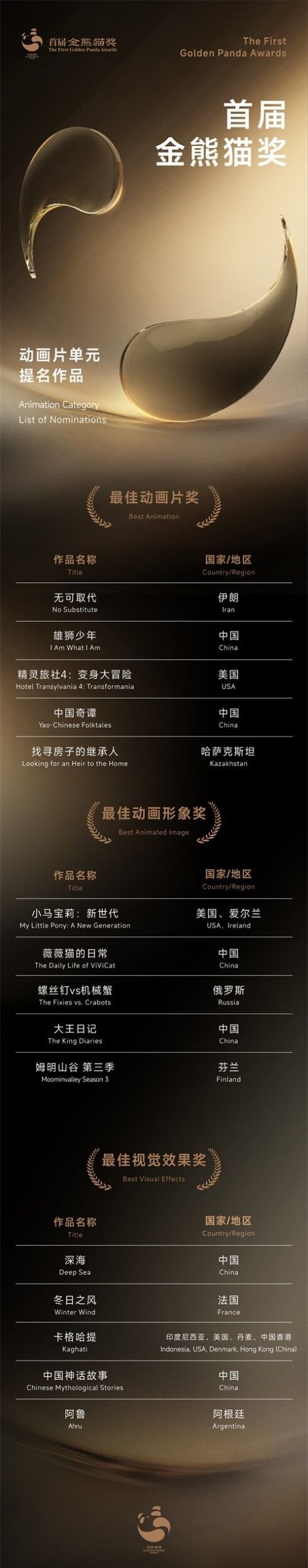 《小马宝莉:新世代 》《薇薇猫的日常》《螺丝钉vs机械蟹 》《大王日记 》《姆明山谷(第三季)》将角逐最佳动画形象奖;《深海 》《冬日之风》《卡格哈提 》《中国神话故事》《阿鲁》则将角逐最佳动画视觉效果奖 。