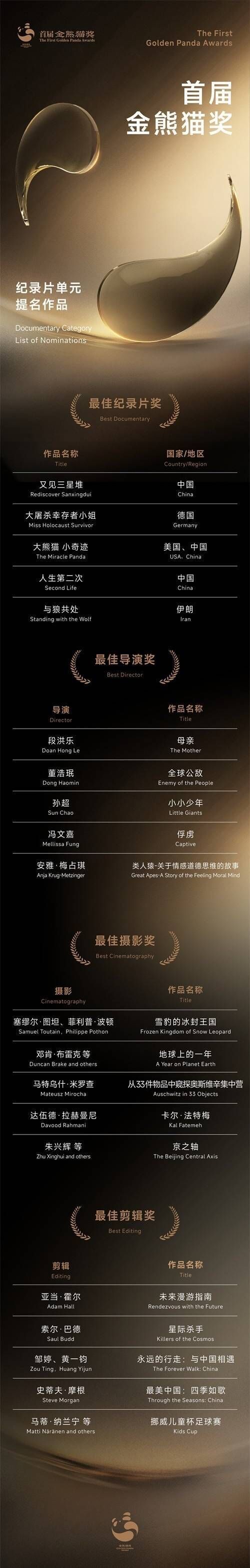 首届金熊猫奖将于9月19日至20日在成都举行,届时将颁发电影、电视剧、纪录片、动画片四大单元共25个奖项。8月30日,在首届金熊猫奖倒计时20天之际,记者了解到,纪录片单元和动画片单元提名作品名单正式揭晓。