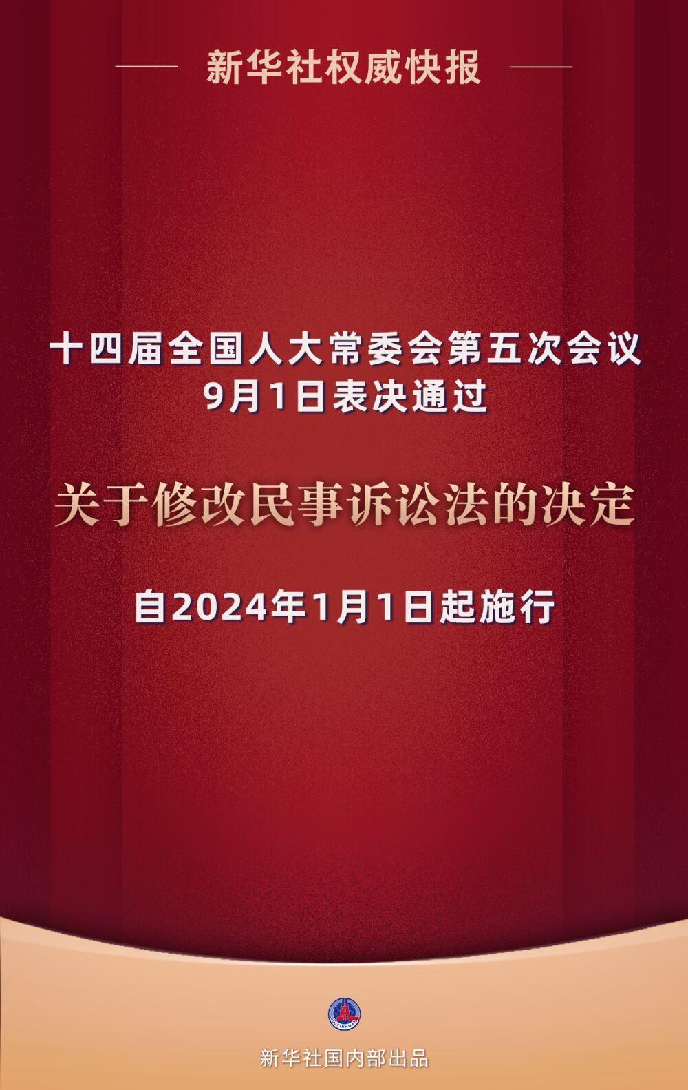 9月1日,十四届全国人大常委会第五次会议表决通过关于修改民事诉讼法的决定,自2024年1月1日起施行。