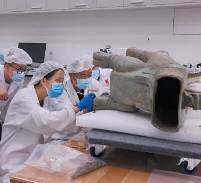 “三星堆的金器受损都很严重,刚出土时基本无法完全确定原有形状。”鲁海子说,他还记得,5号坑黄金大面具刚发现时,被泥土挤压变形成不到两厘米厚的一块,静静地埋在坑中。在国家博物馆的专家到来之前,他连续几天进行相关准备工作,提取金面具的相关成分进行检测,判断矫形的可行性,为后期工作提供基础数据和技术保障。