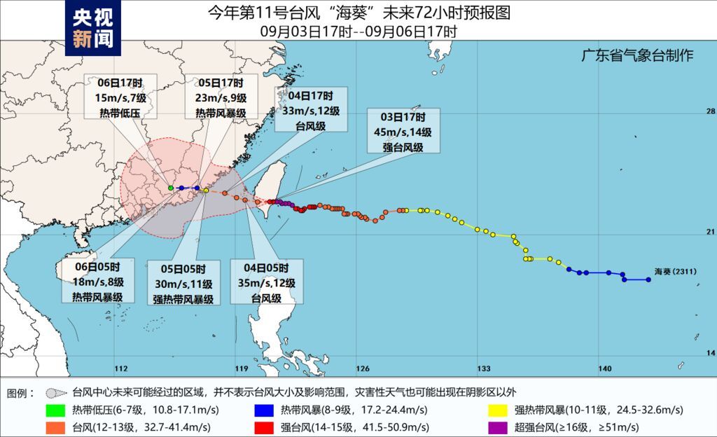 9月3日,据广东省气象台消息,今年第11号台风“海葵”将于3日半夜进入台湾海峡,强度减弱、移速减慢,向闽南、粤东沿海靠近,较大可能于5日以强热带风暴级(10~11级)登陆粤闽交界沿海,或严重影响广东,需提前做好台风防御准备工作。