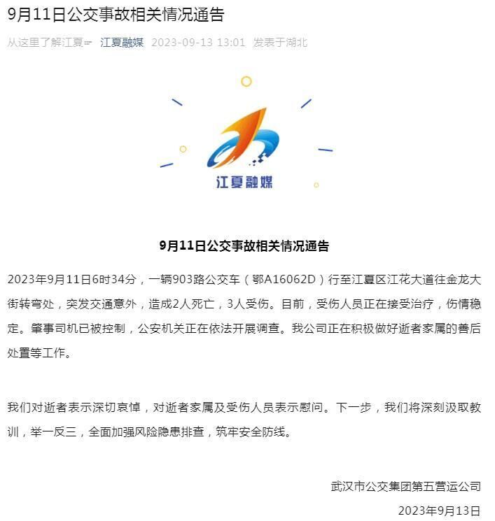 2023年9月11日6时34分,一辆903路公交车(鄂A16062D)行至江夏区江花大道往金龙大街转弯处,突发交通意外,造成2人死亡,3人受伤。目前,受伤人员正在接受治疗,伤情稳定。肇事司机已被控制,公安机关正在依法开展调查。我公司正在积极做好逝者家属的善后处置等工作。