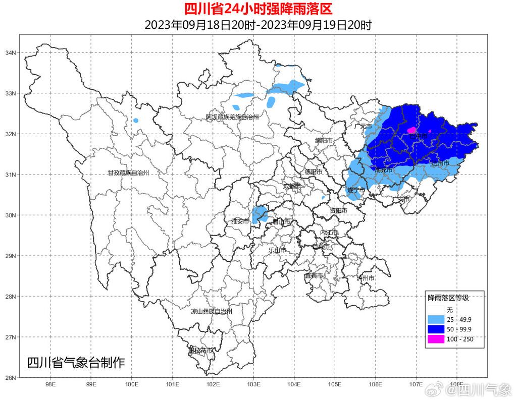四川省气象台9月18日15时32分继续发布暴雨蓝色预警:9月18日20时到19日20时,巴中、广元东部、南充和达州2市北部有暴雨(雨量50~80毫米),局部地方有大暴雨(雨量100~120毫米),最大小时雨量30~50毫米。另外,阿坝州北部的局部地方有大雨(25~40毫米)。