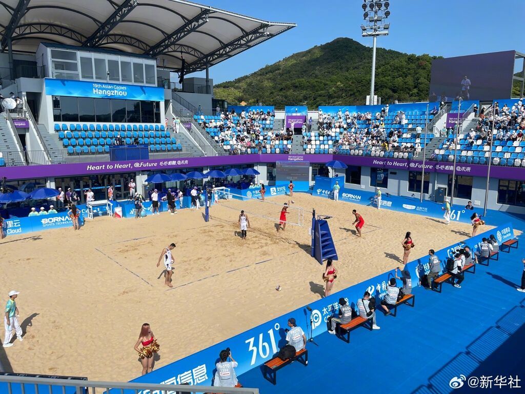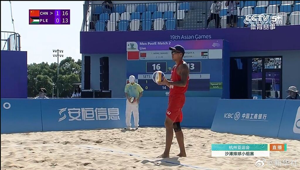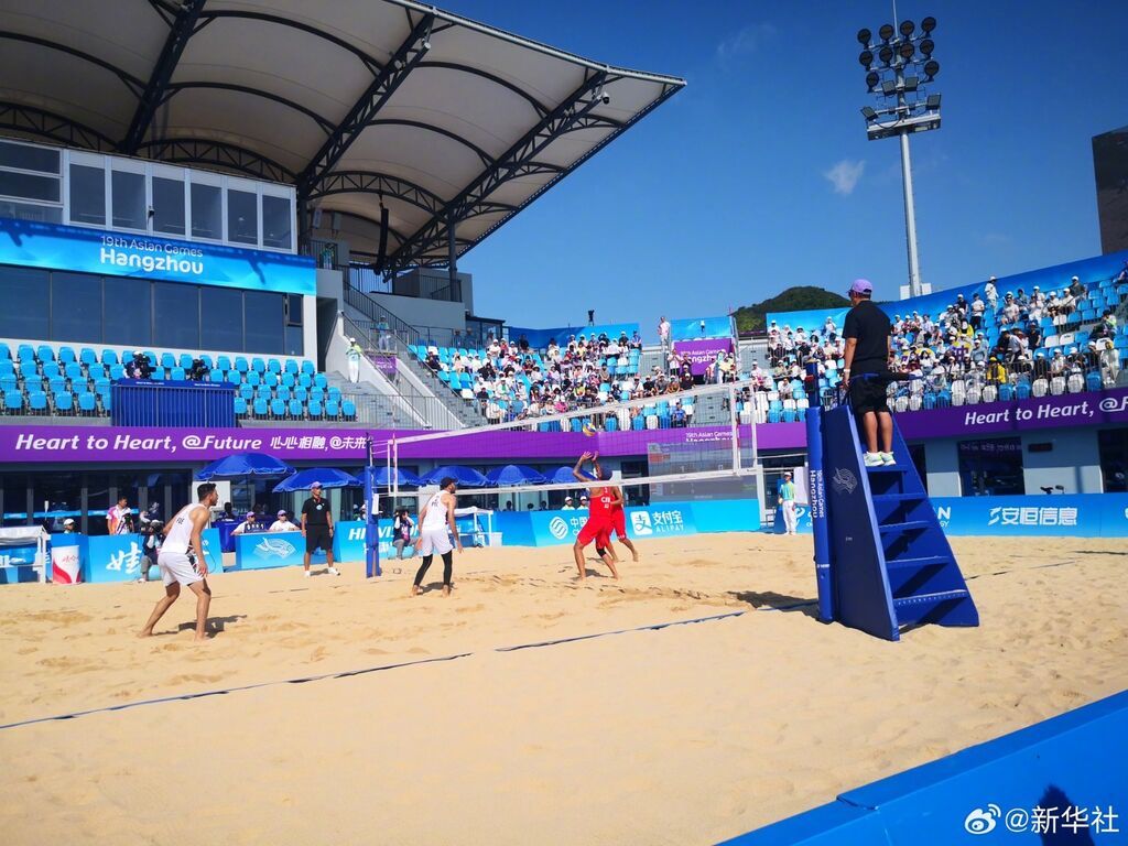 19日,在19届亚运会沙滩排球小组赛揭幕战中,中国男子沙滩排球队战胜巴勒斯坦队,取得开门红。(记者:刘博)