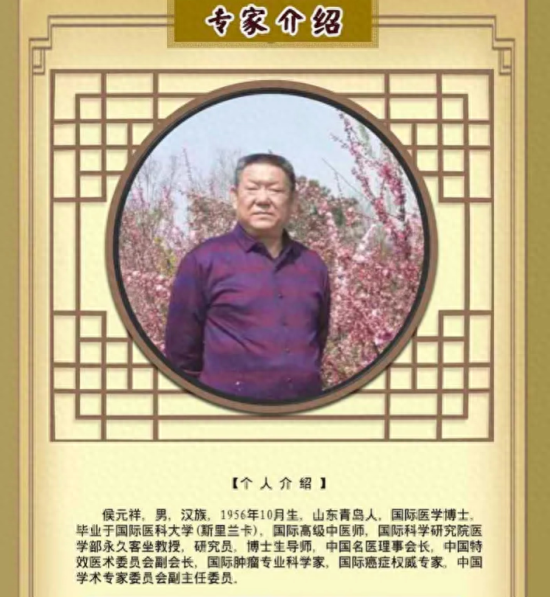 在多个网站上,侯元祥自称毕业于国际医科大学,是主任医师、国际医学博士、中国医学科学院教授,世界中医药协会永久会员,国际医学科学院客座教授、国家药品监督管理局新药评审专家,兼淄博瑞德中医研究院院长、中国医科大附属医院名誉院长,2004年度中国科技劳模、研究肿瘤有30年临床经验。