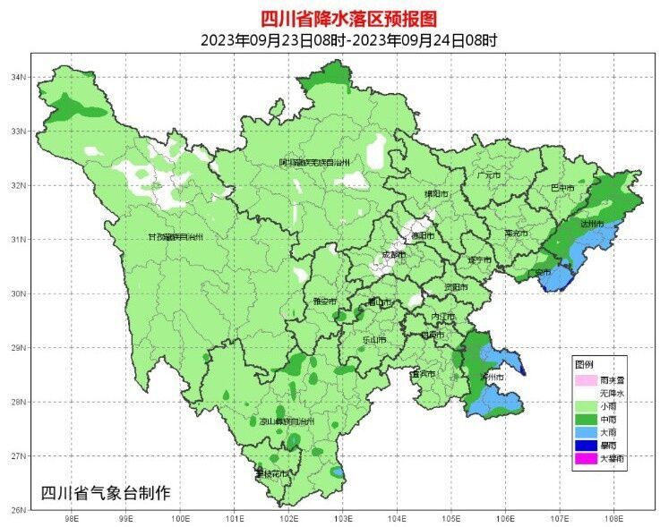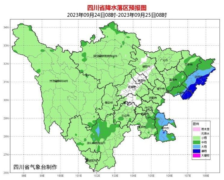 预计9月下旬,四川大部地方雨日较多,23日至25日和27日至28日分别有一次降水天气过程,局地强度较大,其中24日至25日盆地东北部和攀西地区有中到大雨,局部暴雨。