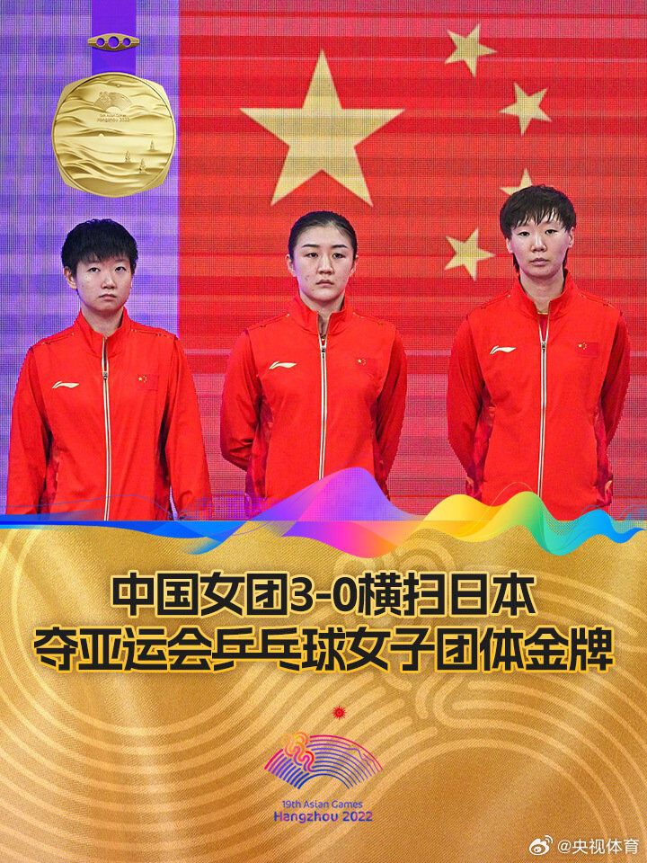 在刚刚结束的#杭州亚运会#乒乓球女子团体决赛中,中国队表现优异,以3-0击败日本队,夺得金牌!恭喜中国乒乓球队!