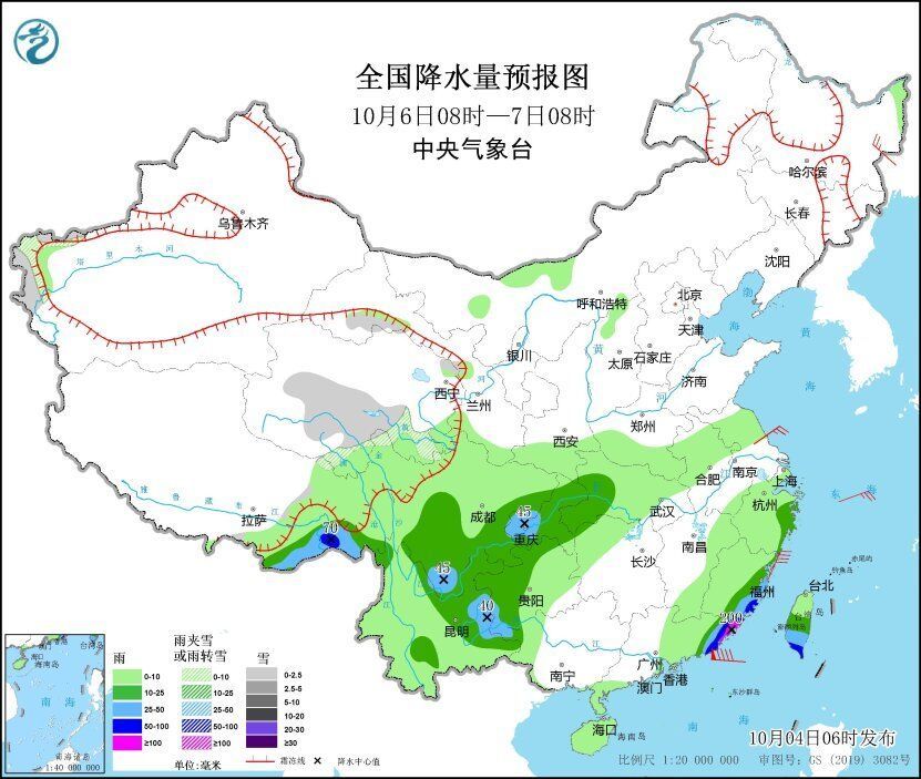 10月6日08时至7日08时,西藏东南部、四川中南部、云南中东部、贵州北部和西部、重庆、湖北西部、广东东部、福建东部、台湾岛南部等地部分地区有中到大雨,其中,西藏东南部、福建东南部、广东东南部、台湾岛南部等地部分地区有暴雨或大暴雨(100~200毫米)(见图3)。