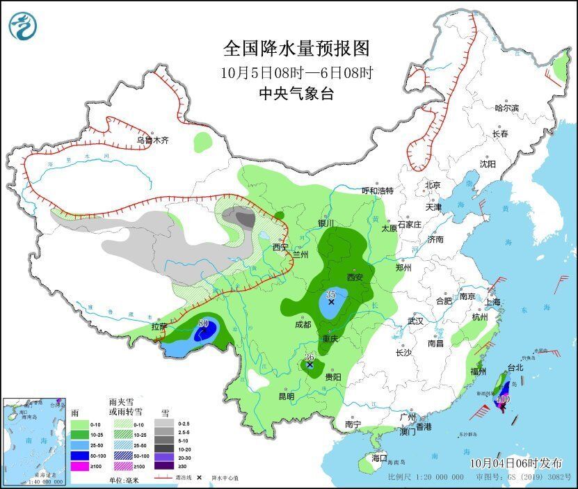 10月4日08时至5日08时,新疆阿勒泰山区和南疆南部山区、西藏中西部、青海大部、甘肃西南部等地有小到中雪或雨夹雪,其中青海中南部部分地区有大到暴雪;台湾岛中东部有暴雨到大暴雨,局地特大暴雨(250-300毫米);甘肃中东部、陕西中南部、四川东北部、重庆大部、贵州北部、湖北西部等地有中到大雨,局地暴雨。内蒙古中东部、东北地区大部等地部分地区有4~6级风(见图1)。
