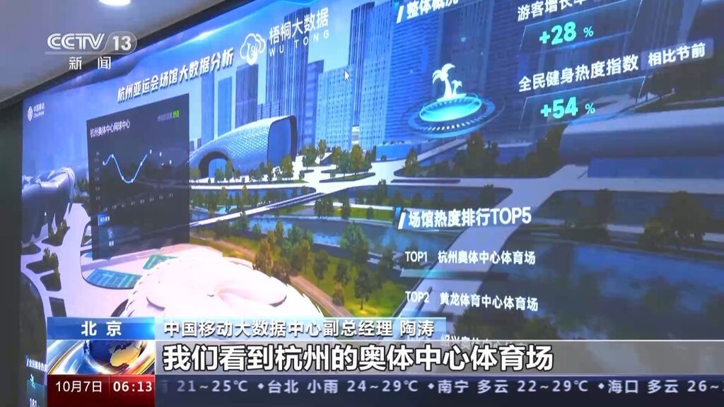 中国移动大数据中心副总经理 陶涛:前往亚运会主要举办城市的游客的数量相比节前一周日均增幅超过28%,主要是来自长三角地区以及津京冀等地区。根据我们对于线上订票以及搜索这些数据的分析,我们看到杭州的奥体中心体育场、黄龙体育中心体育场以及绍兴奥体中心体育馆这三个场馆是最热的体育场馆。