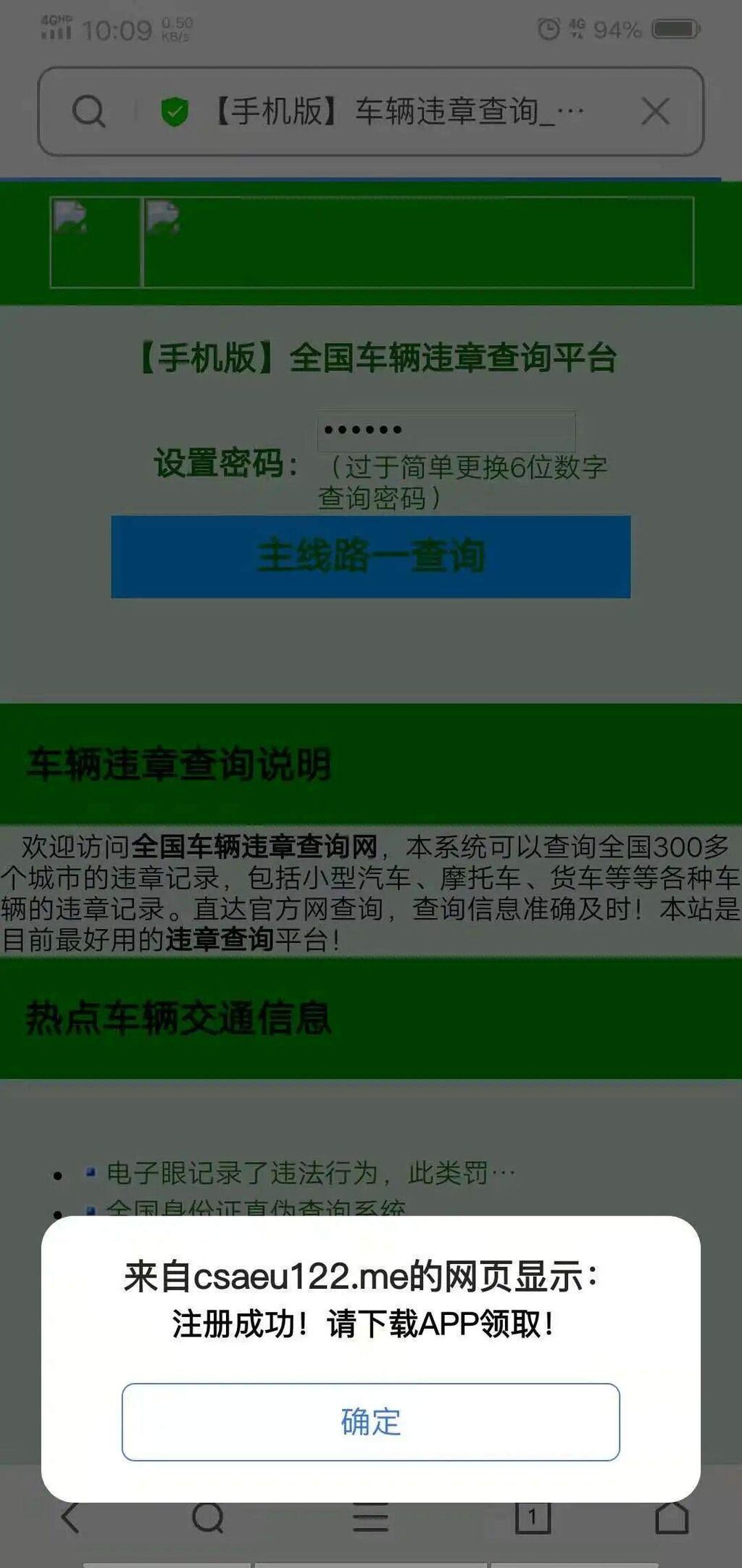 点击链接后,弹出的是“山寨版”交通违法查询平台,如果按要求输入姓名、身份证信息、手机号、设置密码,就会泄露很多个人信息。骗子要的不止这些,下一步是引导受害人下载诈骗App,达到骗钱的目的。