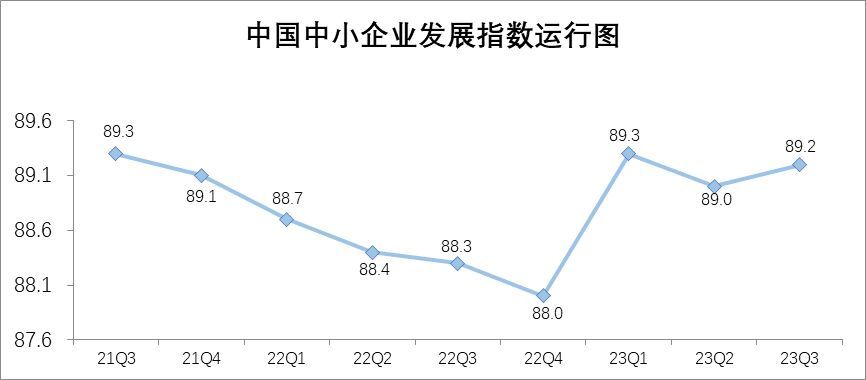 数据显示,中国中小企业发展指数今年一季度大幅上升1.3点,二季度回落了0.3点,三季度再次上升0.2点,为89.2。