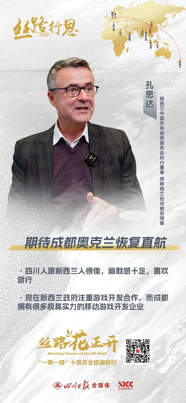 孔思达:我在成都生活了四年,回忆那段时光,脑海里出现最多的就是四川人。四川人跟新西兰人很像,幽默感十足,喜欢旅行。很多新西兰人都知道,川菜是四川的招牌,而我还喜欢四川文化。四川作为旅游大省,我相信越来越多的新西兰人会被四川吸引,希望能够看到两地人员双向流动,新西兰人也可以前往四川寻找商机、学习汉语等等。