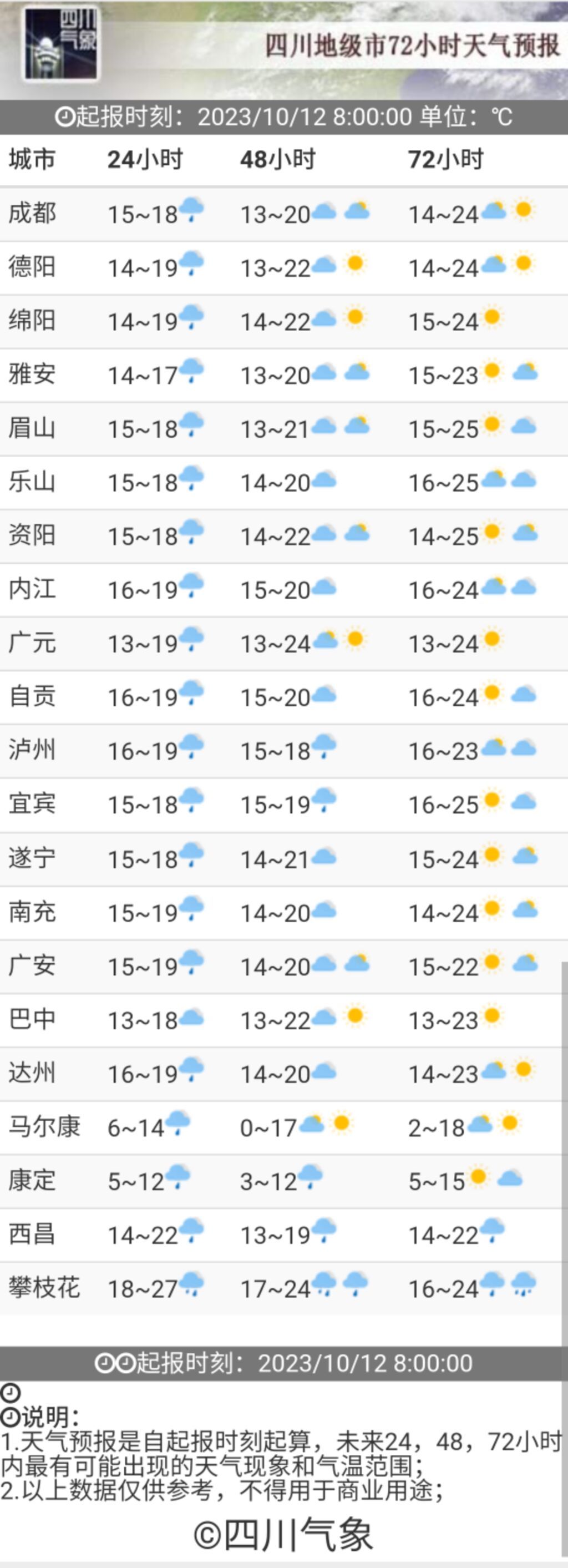 根据四川省气象台今天(10月12日)早上新鲜出炉的天气预报 ,预计: