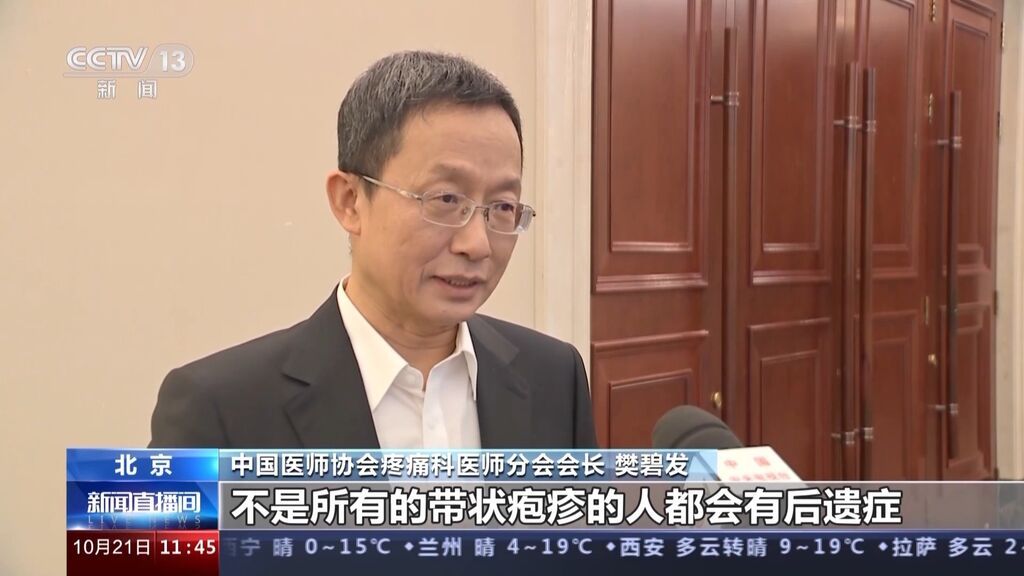 中国医师协会疼痛科医师分会会长 樊碧发:不是所有的带状疱疹的人都会有后遗症,下述几类人风险特别高,我们叫独立的风险因素,尤其五十岁以上人得的话,他是遗留后遗症的高发人群。免疫功能障碍的人是遗留后遗症多发人群,正在使用抗免疫药等等这都是,还有比如其他重大疾病。还有我们也注意到了,急性期疼得厉害的人是高危人群,急性期疼的人,先疼了很长时间,疼了一个礼拜才出了疱的等等,这种人往往容易把后遗症留下来。