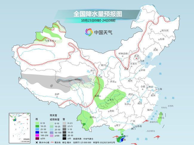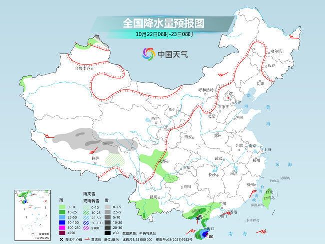 明天,新疆北疆北部和沿天山地区、西藏北部、青海中南部等地的部分地区有小到中雪或雨夹雪,青海南部局地有大雪。海南岛等地部分地区有中到大雨,其中,海南岛东南部等地局地有暴雨。