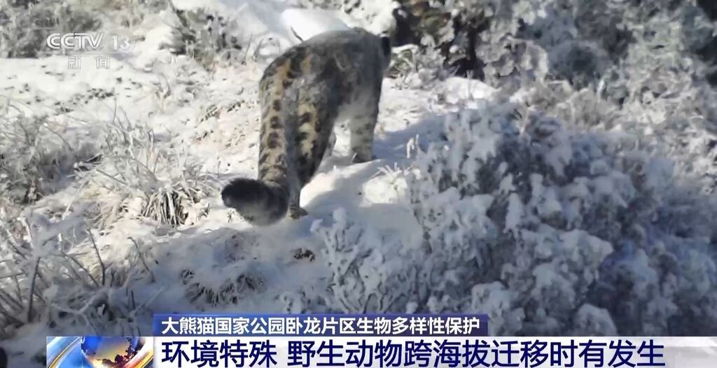 在下一个画面中,雪豹也一反常态,打破了高海拔雪线附近的常规活动路线,下山进入到海拔3000米左右的大熊猫和川金丝猴的栖息地,进行了三个小时的游览。