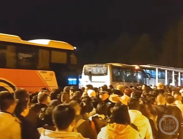 相关视频显示,夜晚,大量游客因为挤在一起,现场有些混乱。还有视频显示,夜色中,大量游客排队乘坐车辆。
