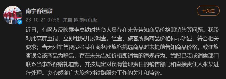 10月21日,中国铁路南宁局南宁客运段相关工作人员回应:“近日,有网友反映乘坐高铁时,售货人员存在未先告知商品价格即销售等问题。我段对此高度重视,立即组织开展调查。
