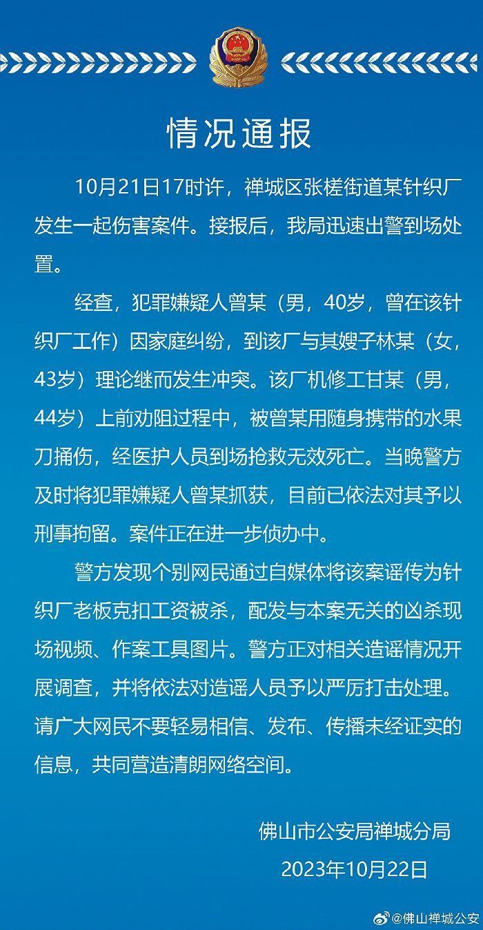 警方发现个别网民通过自媒体将该案谣传为针织厂老板克扣工资被杀,配发与本案无关的凶杀现场视频、作案工具图片。警方正对相关造谣情况开展调查,并将依法对造谣人员予以严厉打击处理。